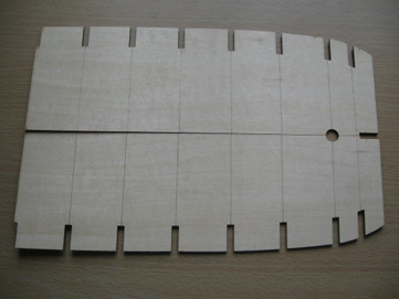 Zoals voorheen de plakranden van de spanten opruwen, zonder de vorm van de spanten te veranderen. Nog niet met de kiel verbinden!